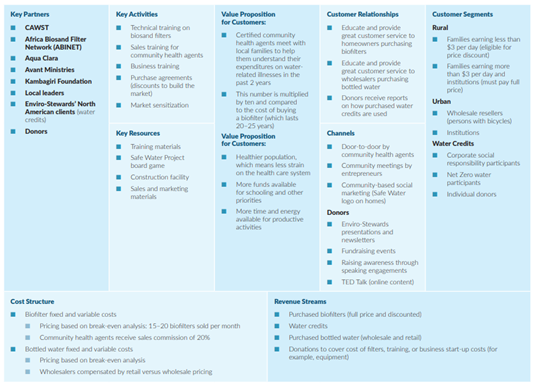The BMC is a useful methodology for water practitioners interested in developing a new approach for a project, improving its implementation, or taking a water technology out of the lab and converting it into a business idea. It is a first step for the successful development of a business model or project idea in the design phase. The experience of the “Safe Water Project”, a market-based approach to deliver bio sand filters and bottle refilling services to consumers in South Sudan, Uganda, and Kenya, provides a good practical example of how the BMC methodology can be applied to water projects ideas and initiatives (Figure 2).