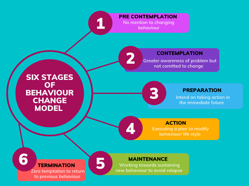 - Maintenance: here the individual tries to consistently maintain the changed behaviour. In this regard, consistency can be linked to a cycle of information and engagement to create an environment that is conducive towards positive change.