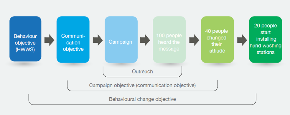 5. Monitoring and Evaluation: refers to the tracking of existing statistics related to the targeted behaviour, tracking outputs to ensure that materials are utilised as planned with desired effects, and tracking the reaction of the target audience to ensure that they are motivated by the materials to change their behaviour (e.g., levels of pollution in rivers over time, % of people reporting washing their hands with water and soap after defecations, and % of households with residual chlorine in their drinking water). Evaluation of the monitoring results will also help identify the lessons learned, where the programme is weak and needs revision, and where it is strong and should be replicated. Feedback from the target groups and stakeholders are absolute necessities as based on these feedbacks, new sets of knowledge can be incorporated into the participant’s lives thus laying the foundation for new sets of behaviour. Additionally, when measuring effectiveness, BCC specialists must make a distinction between three levels; change in behaviour, the communication objective, and the outreach objective (Figure 3).