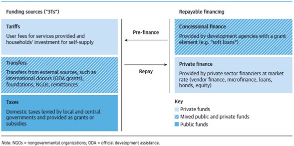 Water is paid for by tariffs from water users, subsidies (from taxes) from national taxpayers, and/or grants (transfers) from external sources or philanthropists. These three sources, better knowns as the 3Ts, make up the basic revenues which can be used to attract financing through repayable sources of finance (Figure 1).