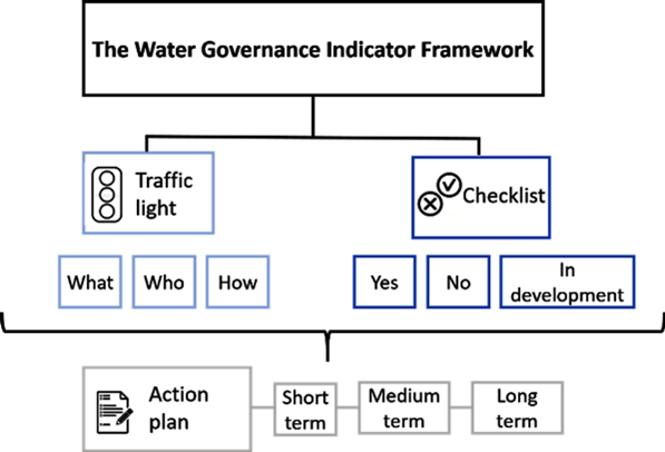 • OECD Water Governance Principles and Indicator Framework: this framework presents a self-assessment tool to identify the current state of water governance policy frameworks, institutions, and instruments and how they should be improved over time. It supports the implementation of OECD Water Governance Principles, providing for efficient, effective, and inclusive water governance. The framework consists of a ‘traffic light system’ of 36 governance indicators, a checklist and an action plan for future improvements (OECD, 2018). The scope of application covers all governance scales, whether local, basin or national, and follows a multi-stakeholder approach.