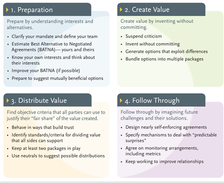 - Preparation: understanding your own interest and alternatives (BATNA), as well as those of others.