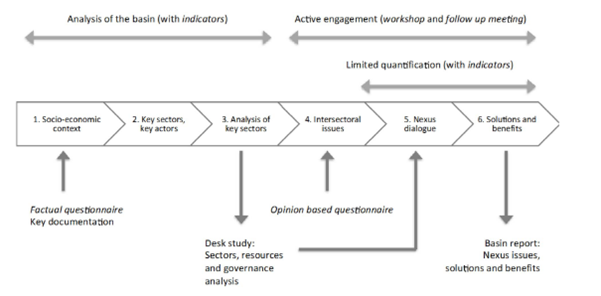 The process provides for a progression from the overall socioeconomic context of a basin and its surrounding region to a zooming in on the specific intersectoral issues at play. Throughout the assessment, different participatory methods should be mobilised to gather information and facilitate dialogue among stakeholders, as well as frameworks and tools to analyse and quantify interlinkages, as appropriate and applicable.