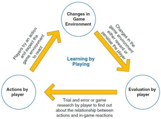 Serious games offer a series of loops where players face challenges and make choices between several action options. According to the action chosen, the game scenario will change to present the consequences of decisions to penalise or reward the player accordingly. The game scenario changes are commonly based on scientific understanding and robust modelling, which include may include random events based on external forces of politics, hydrology, or ecology. The game allows the users to understand a situation by thinking of it as a game rather than a real-world challenge and as players rather than competing stakeholders (Bathke, 2019). This can be considered as learning by playing (Figure 1).