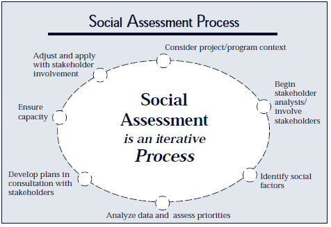 Social assessments (SA) has long been used by social scientists for analysing the conditions, causes, and consequences of social phenomena and social life. SAs provide a framework to prioritise, gather, analyse, and incorporate social information such as dynamics of demography, socioeconomy, displacement gender, and poverty to foster a participatory approach into the design, delivery, and evaluation of large infrastructure projects, agricultural reforms, utility reforms, civil service reforms, and fiscal policies (Rietbergen-Mccracken, 1998). They enable developers and planners to understand the impact of the project on people and the impact of people on the project. It further helps to establish an appropriate framework for stakeholder identification and their participation in project planning, programming or policy selection, design, implementation, monitoring and evaluation. Since there are a wide array of social indicators, social assessments need to be selective and strategic, focusing variables of operational relevance (McPhail, 2003).